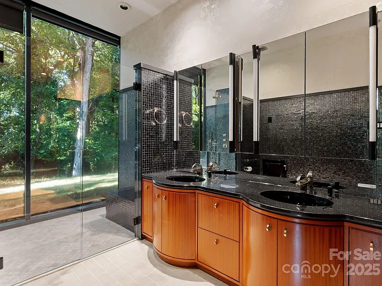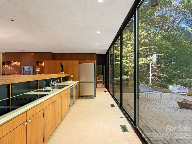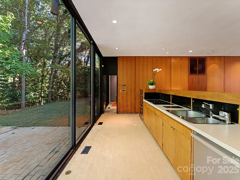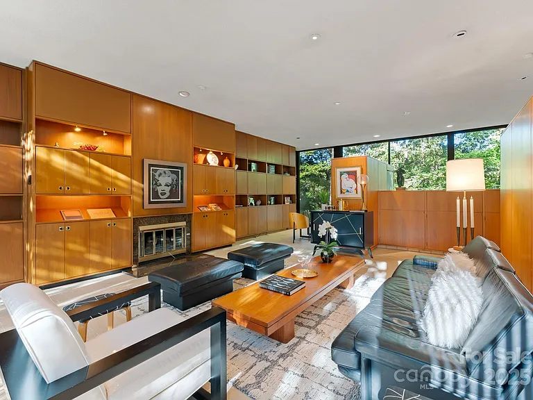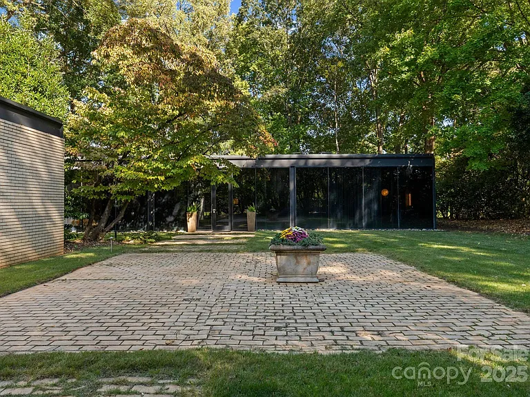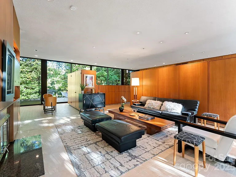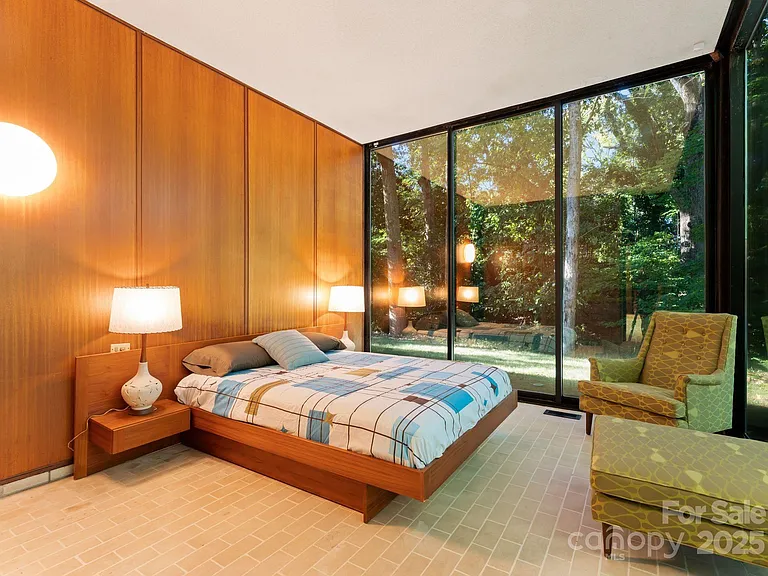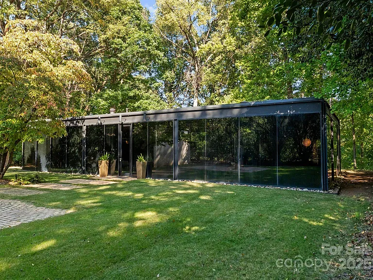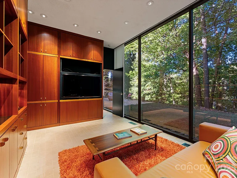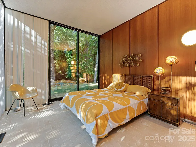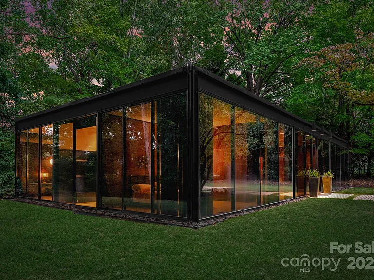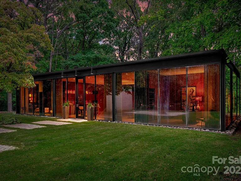 "The Bates Glass House, circa 1960, was designed by prominent Charlotte architect Charles Bates as his family home, drawing inspiration from Philip Johnson's iconic New Canaan, Connecticut Glass House built a decade prior. The avant-garde nature of steel and glass pavilion homes from the mid-century era contribute to their rarity both locally and nationally. As much a work of art as it is a residence, The Bates Glass House is one of few Charlotte residences which can claim elite Trophy Property status. Nestled on a serene wooded lot overlooking a pond in what was once rural Charlotte, the residence today is centrally located in our expanding city, yet still retains its original sense of seclusion. The interior teak wall panels and built-ins combined with terrazzo brick flooring create a warm and balanced aesthetic juxtaposed to the glass and steel facade. Seamless integration with the natural surroundings extends a soothing connection to the natural world. The Bates Glass House is truly exceptional in every way. Stay tuned for additional photos to be released throughout the week leading up to Active status on Friday October 17th. This home is expertly staged by Charlotte Vintage with over 50 pieces of period authentic vintage furnishings and decor, all of which are for sale." - Charlie Miller, 5 Points Realty